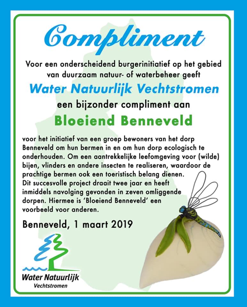 Op 1 maart 2019 heeft ‘Bloeiend Benneveld’ een prijs ontvangen van de waterschapspartij Water Natuurlijk Vechtstromen. Wij zijn uiteraard trots op dit compliment. Na de uitreiking van de prijs hebben wij Klaas Mulder die als vertegenwoordiger van de gemeente aanwezig was bedankt voor alle steun die wij van de gemeente hebben gekregen. Zonder deze steun waren wij nooit zo ver gekomen.